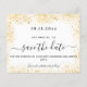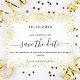 Um moderno e elegante Salve a Data para um casamento. Um fundo branco decorado com brilho de ouro falso. Personalize e adicione uma data e nomes. O texto: Salvar a Data é gravado com um script de estilo com letra de tendência grande.