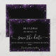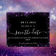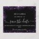 Um moderno e elegante Salve a Data para um casamento. Um fundo preto decorado com brilho roxo. Personalize e adicione uma data e nomes. O texto: Salvar a Data é gravado com um script de estilo com letra de tendência grande.
