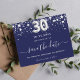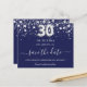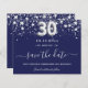 Uma moeda e uma tendência Salve a placa de Data para um aniversário de 30 anos. Um fundo azul marinho colorido. Decorado com estrelas de falso prata. O texto: Salvar a Data é gravado com um script de estilo com letra de tendência grande. O número 30 é gravado com uma fonte no estilo do balão.