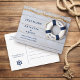 Este moderno cartão de identidade é perfeito para um casamento com um tema náutico. Ele apresenta um salva-vidas de barco em um fundo de textura de madeira. Uma corda e uma rede de pesca contribuem para o sentimento do mar. Use esta opção para salvar a data de um casamento na praia, um casamento no mar ou um casamento de destino. Este cartão é fácil de personalizar com as informações do casamento. Adicione o endereço de retorno e uma mensagem especial no verso. Este cartão postal é de 5,6" x 4,25" (paisagem) e é impresso no estoque de cartão ultra-pesado de 120 lb com acabamento brilhante.