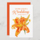 Pintor detalhado de aquarela de uma flor Hemerocallis, incrivelmente bela, neste bonito convite de casamento floral cor de laranja e amarelo. Capturadas para o dia como essas flores tendem a durar no máximo 24 horas, então uma flor muito apropriada para o seu único dia especial de casamento. Convite para casamento cor de laranja Hemerocallis, design adaptado da pintura original de aquarela por Sarah Trett.