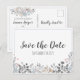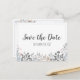 Azul-claro, cinzas e elementos botânicos cor-de-rosa se juntam para criar este cartão postal "Salvar a Data" de Casamento Floral Azul Botânico. Mostrado com papel mate.
