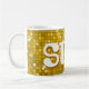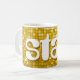 Mug com um padrão impresso estilizado, divertido e estilizado, de "azulejo espelhado disco" em tons de ouro e branco amarelos e texto retrô. Pode ser usado como um fundo para o seu próprio texto, imagens e ideias. Observe que esta é uma imagem de arte digital impressa, ela não brilha ou contém espelhos reais ou brilho.