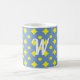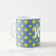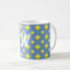 Bonito padrão azul e amarelo nesta caneca branca com letras brancas para o seu monograma ou duas iniciais. O azul e o amarelo alegres vai bem com a casa de fazenda, a casa de campo e os estilos de casa de campo, ou simplesmente para qualquer indivíduo que ame essas combinações de cores.