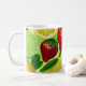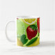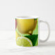 Uma caneca clássica vibrante com limões, limas e morangos brilhantes em um estilo botânico fresco em um fundo verde suave. Sua paleta alegre e estival adiciona um toque animado ao café da manhã, pausas para chá e momentos aconchegantes na cozinha. Uma escolha elegante para mulheres que amam motivos frutados, louças coloridas e acessórios prontos para presente.