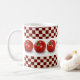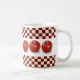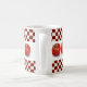 Uma caneca bonito perfeita para a sopa bebendo em um dia frio! Caracteriza o vermelho e o branco verifica na parte superior e na parte inferior. São no centro as imagens de seis tomates e da sopa do tomate do subtítulo.