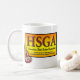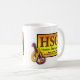 Esta caneca de 15 onças tem uma versão leve diferente do logotipo de HSGA, com a guitarra fora ao lado, repetido em ambos os lados.