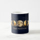 Um ritual matinal tão lindo quanto o céu noturno. Esta incrível caneca de fase lunar celestial apresenta o ciclo lunar completo em volta — desde a lua nova até a crescente, a lua cheia brilhante e além — colocada contra um fundo azul-marinho profundo com flores brancas delicadas e estrelas douradas espalhadas.