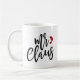 Esta caneca festiva do feriado caracteriza o Sr. Claus em um roteiro preto moderno com um chapéu pequeno do papai noel na extremidade do Sr. da palavra.
