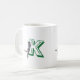 Gato alcançando as letras do nome a partir da parte inferior. O verso mostra uma letra maiúscula grande deste lado, com um gato branco e marrom em pé sobre as patas traseiras na borda esquerda. O texto é verde e pode ser personalizado com sua letra e nome.