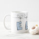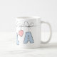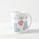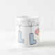 Caneca fofa com nome pessoal Ella com letra de bolinhas azuis pendurada em uma corda junto com um coração rosa.