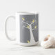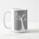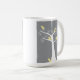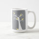 Cinco adoráveis pássaros abstrato-amarelos saem numa árvore branca contra um fundo de cinza numa caneca