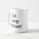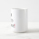 Caneca branca com texto preto e um ponto de exclamação vermelho