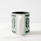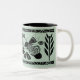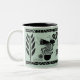 Desenhos de tinta das plantas e das antigas abelhas geométricas na lite caneca verde. Inspirado pelo estilo da cerâmica antiga. Arte rock.