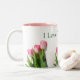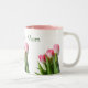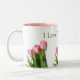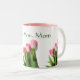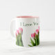 Diga "eu te amo, mamã" com esta caneca bonita. Uma fotografia original de tulipas frescas bonito do rosa do corte é por todos os lados. Fácil personalizar para ela e mudar o texto com algum nome, dizer, ou mesmo deixar para fora as palavras se você quer. Lembre-a de seu amor diário como bebe sua bebida.