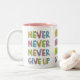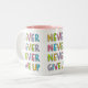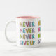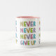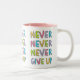 Caneca customizável com slogan inspirador para a determinação e a confiança - nunca nunca nunca dê acima - na tipografia colorida, estilo dos desenhos animados.