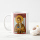 Esta caneca do chocolate quente projetada por Christopher C. Smith descreve Joseph Smith pintado ao estilo de um santo católico medieval. Embreando a bíblia e o livro dos dois livros fundacionais do Mormon-Mormonism do escritura-inclina sua cabeça no projecto. Uma pomba senta-se em seu ombro, simbolizando o Espírito Santo, e bordadura de um halo sua cabeça. Veste o casaco de cabedal marrom rústico de um profeta americano do século XIX despretensioso.