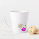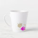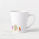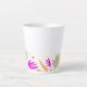 Essa caneca apresenta na sua fronteira inferior um conjunto de lâminas e flores em bege, magenta, vermelho e laranja sobre o fundo branco.