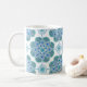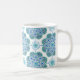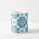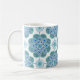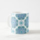 Esta linda caneca apresenta um intrincado padrão azulejo de medalhões azuis e verdes. As cores incluem o ceruliano, a marta de menta e o girassol em fundo branco. Comprar para a próxima festa de chá ou reunião do clube de livros. Isto vai ficar encantador no seu país ou recuo costeiro. Esta design é do Azulejo de Oregon Fay Jones Day.