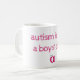 A imagem é o texto em uma pia batismal colorida magenta do esboço: o autismo não é um clube dos meninos. Abaixo do texto é o logotipo da ARESTA de um lowercase magenta a com um azul e uma libélula colher-dada forma cinzas empoleirados na parte superior.