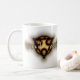 Caneca branca com o logotipo do PM Saari. Todos os trabalhos de arte por PM Saari.