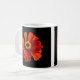 Uma caneca com foto de uma flor de margarida vermelha contra um fundo preto