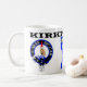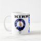 Uma caneca Kirkpatrick com o crachá Kirkpatrick em dois idiomas diferentes.