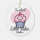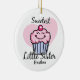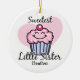 Nossa IRMÃ MAIS NOVA que MAIS DOCE o design é uma maneira bonito de comemorar a irmã mais nova está em sua família. Caracterizando um cupcake de sorriso doce com glacé cor-de-rosa e uma cereja vermelha grande na parte superior com um fundo cor-de-rosa do coração. Aperfeiçoe para um aniversário ou sua árvore de Natal. Texto customizável. Também disponível em t-shirt e em presentes. Original de PinkInkArt!