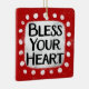 "Abençoe seu coração" é um design de texto bonito em vermelho com texto preto, junto com uma forma branca de sotaque e pontos brancos texturizados ao seu redor.