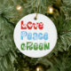 Amor, Paz, ornamento personalizado Verde, com as palavras Amor, Paz, Verde com carateres divertidos com corações, o sinal de paz e folhas dos anos 60.