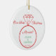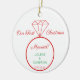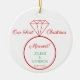 Este artigo é perfeito para casais recém-casados que celebram o Natal pela primeira vez como casal casado. A frente apresenta uma aliança de casamento com personalização para nomes e a data do casamento. A parte de trás do ornamento tem um padrão de listras vermelho e branco para flocos extras de feriado!