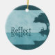Um desenho texturizado verde-azul que apresenta a silhueta de um homem sentado debaixo de uma árvore por um lago contemplando. A palavra "Refletir" repousa na superfície do lago, o texto e sombras refletidos na água perfeitamente estável.