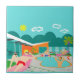 Este azulejo alegre retro da festa na piscina caracteriza quatro beefcakes hunky que têm uma estadia velha alegre enquanto batem o calor do Palm Springs lounging ao redor a água azul de turquesa de sua Bumerangue atômico piscina dada forma. A arquitetura moderna do meio século na casa de pedra fabulosa, alaranjada é claramente bens imobiliários principais, dados a vista das montanhas no fundo. Um sol amarelo do starburst brilha brilhantemente no céu de turquesa assim que você pode ver cada detalhe encantador--dos flamingos kitschy, cor-de-rosa aos anos 50 listrados, cerca ventoso dos blocos. E naturalmente que casa do Palm Springs estaria completa sem uma palmeira?