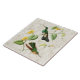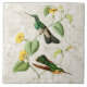 Azulejo com uma ilustração do vintage do colibri Branco-throated de Mountaingem (castaneoventris de Lampornis.) Dois colibris verde-claro com máscaraes protectoras preto e branco empoleiram-se em uma videira tropical (jalappus de Convolvuolus) com flores amarelas, em um fundo claro do teste padrão do mármore do ouro.