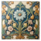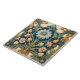 Azulejo floral com uma flor azul central, rodeada de flores cor-de-rosa e amarelas, folhas verdes e espirais ornamentados, todas colocadas sobre um fundo azul escuro.