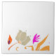 Este azulejo branco apresenta na sua parte inferior um conjunto de flores e folhas beges, vermelhas e laranja voltadas para o lado leste.