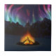 Em um vale coberto de neve em uma noite gelada no morto do inverno uma fogueira salta para cima para espelhar as luzes do norte enchendo o céu acima das montanhas distantes.