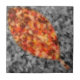 Fotografia de outono, colorida seletivamente, de folhas mirtilosas caídas de crepe, com forma de folha moldada a ouro, vermelha, laranja e amarela, contra fundo preto e branco.