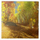 Um caminho supercrescido que percorre a floresta de pássaros em um dia ensolarado de outono. Os troncos preto e branco das árvores contrastam com folhas e gramíneas em todos os tons de ouro, de amarelo pálido a laranja profundo, iluminados pelos raios solares que passam pelos galhos.