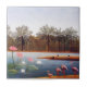 Azulejo Henri Rousseau Flamingoes. Pintura a óleo na canvas desde 1907. O pintor francês Henri Rousseau pintou uma variedade de cenas tropicais baseadas em seus viagens mundiais. Flamingoes retrata uma família de flamingos cor-de-rosa que estão soltando em uma praia. Do aumento da água sobram flores de lótus com flores amarelas, brancas e cor-de-rosa. Nativos caminham pela praia além e o outro lado do rio é coberto por grandes palmeiras com frentes de ondulação. O céu acima é azul com nuvem clara. Um belo presente de arte para fãs de Henri Rousseau, impressionismo poste, primitivismo, pinturas flamingas e arte francesa.