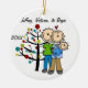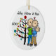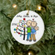 Um ornamento cerâmico redondo bonito do feriado do Natal da lembrança caracteriza uma figura casal da vara com um bebé em uma cobertura azul que está na frente da árvore de Natal decorada com áreas que você pode facilmente personalizar com nomes e data ao ano em curso! Este ornamento bonito da lembrança do feriado faz um grande presente para qualquer um que teve um bebé novo no ano em curso!