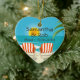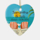 O ornamento TROPICAL da lembrança do CASAMENTO que caracteriza uma cena da praia com dois listrou as cadeiras de praia que enfrentam o mar. Um coração foi tirado entre elas na areia. Texto customizável. Adicione o nome dos noivos, a data do casamento ou o que quer que você gosta! Aperfeiçoe o presente do noivado, ou para o primeiro Natal dos newlyweds. Economias coordenadas os anúncios da data, os ímãs, os cartão, as etiquetas, as etiquetas de endereço e o porte postal também disponíveis. Original de PinkInkArt!