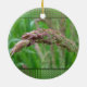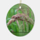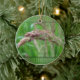 Uma macro de uma flor de grama aspergida com gotículas de água, as sementes virando a ponta roxa contra um pano de fundo de verde rico. Enquadrar a foto é um mosaico de vidro do campo à sua volta.