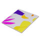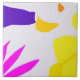 Esse azulejo cerâmico apresenta formas triangulares e orgânicas em fucsia, amarela, roxa e laranja, dispostas na superfície da lavanda.