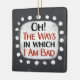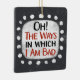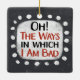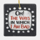 Um design tipográfico divertido que diz "Oh! As Maneiras Em Que Sou Mau". É texto preto e vermelho em um retângulo branco com pontos brancos engraçados e brincalhões ao seu redor, tudo em um fundo de cinza.