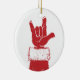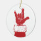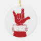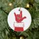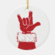 A mão gloved vermelha do papai noel que faz o sinal do ASL para "eu te amo".