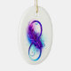Símbolo infinito com uma bela pena pintada em cores roxas e azuis brilhantes sobre fundo branco.
