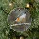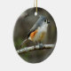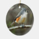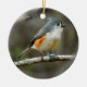 Estes enfeites de natal caracterizam uma foto original de um Titmouse adornado minúsculo no ramo de uma árvore de pêssego.