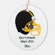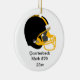 Grandes enfeites de natal do futebol para o jogador que você conhece. A parte dianteira caracteriza um capacete de futebol amarelo e preto. Sob o capacete é um espaço para o nome da equipe, os jogadores nome, o ano ou a toda a outra informação que você goste de incluir. A parte traseira tem um espaço para uma fotografia feita sob encomenda de sua escolha.