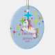 Queira algo especial para esse irmão mais novo? Este ornamento será uma lembrança por muitos próximos anos. Tem claro - fundo azul com uma onda de estrelas coloridas brilhantes. Há um unicórnio com uma juba e uma cauda brilhantes, coloridas. Personalize com um nome e um ano. Nós igualmente temos uma irmã mais velha, e uma irmã média neste design.
